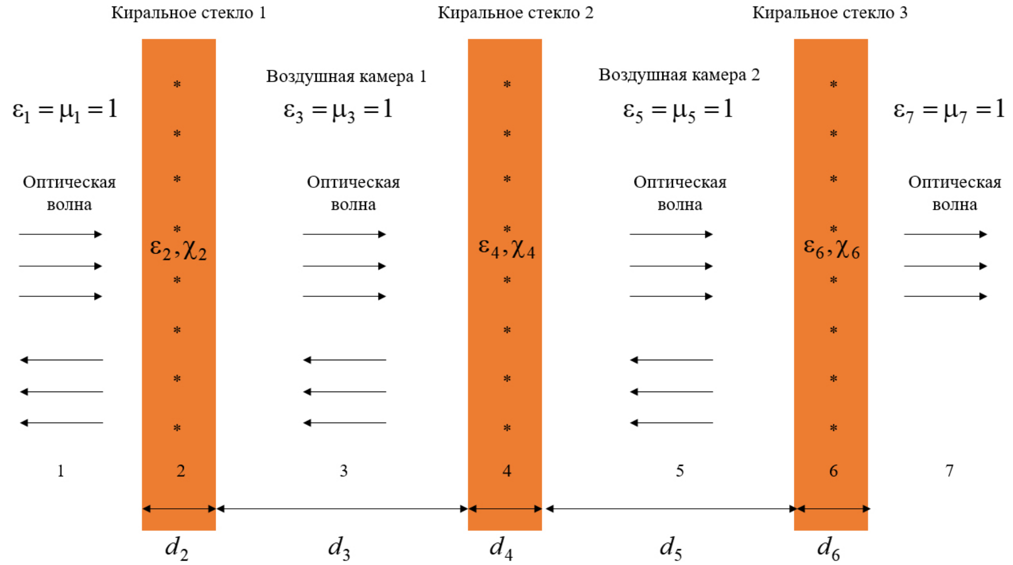 Рассмотрим использование киральных стекол с целью частотно селективной концентрации оптической энергии. С целью практического использования результатов рассмотрим следующую многослойную планарную структуру, состоящую из трех киральных стекол, разделенных двумя воздушными камерами. Геометрия задачи представлена на рис. 1. Структура состоит из трех киральных стекол 2, 4 и 6, разделенных двумя воздушными камерами 3 и 5. В качестве примеси для кварца в киральных стеклах будем использовать оптически прозрачный ниобат лития. Геометрические и электрофизические параметры слоев 2-6 приведены на рис. 1. Области 1 и 7 представляют вакуум.