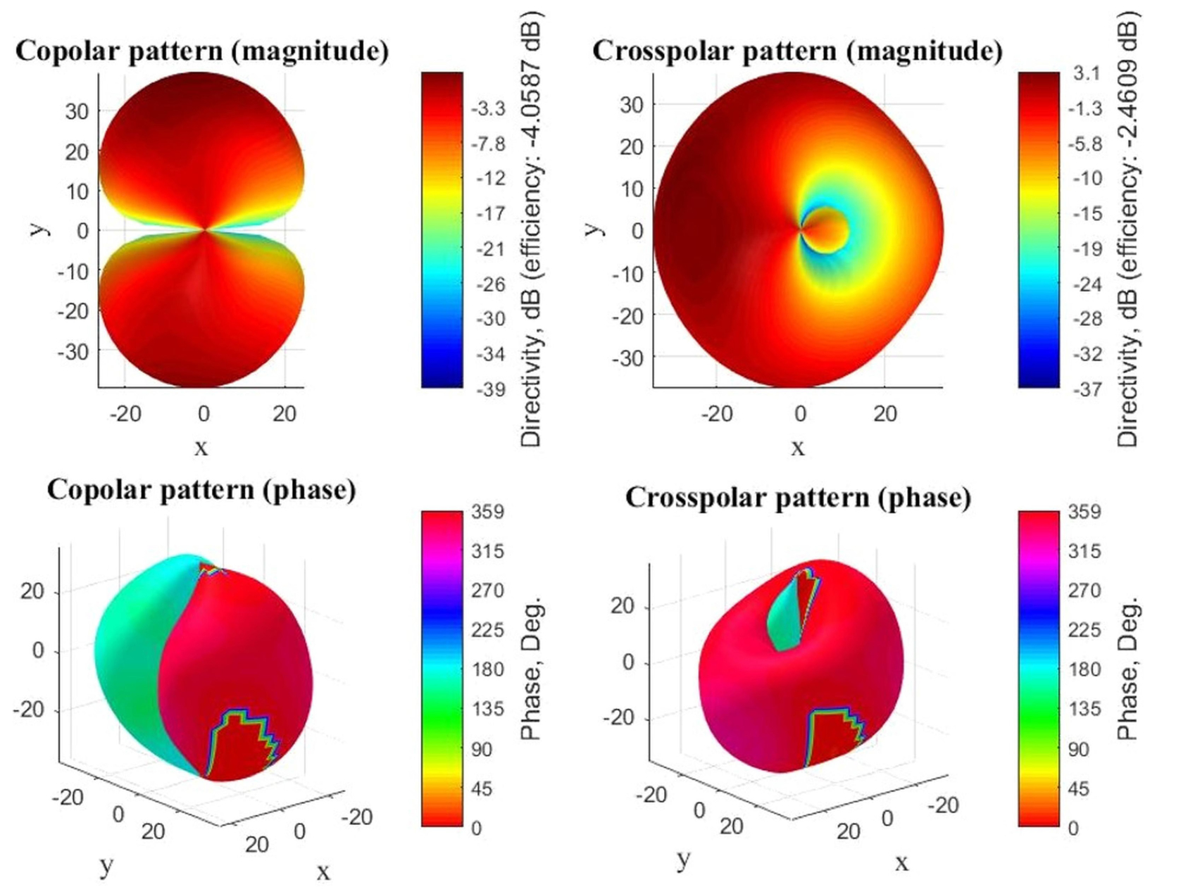 Идеальная ДН номер 1 (то есть ДН изолированного 1-го АЭ, расположенного в начале координат) представлена на рис. 2, где для наглядности приведены трехмерные графики (в сферических координатах) как амплитудной, так и фазовой зависимостей. По формулам сдвига (5)–(6) из этой ДН можно получить идеальные ДН 2-го и 3-го АЭ, идентичных с первым, но размещенных, соответственно, в точках (40 мм; 0; 0) и (40 мм; 0; −40 мм). Максимумы амплитуды ДН на кополярной и кроссполярной компонентах равны −0,534 дБи и 2,245 дБи (имеются в виду модули величин и соответствующих базисным векторам и как указано в (1)–(2)). Максимальное же значение амплитуды векторной ДН