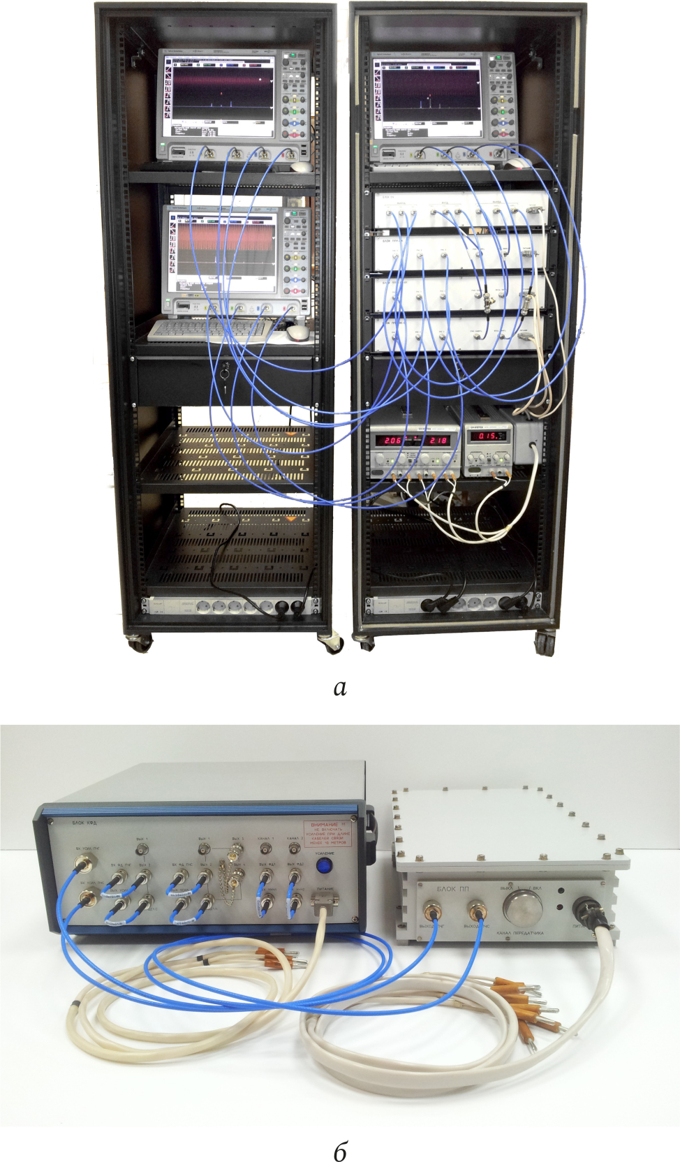 Конструктивные недостатки радиоинтерферометра РИ-03 были учтены при разработке многоканального радиоинтерферометра МРИ-03 (рис. 2, а) ирадиоинтерферометра ПРИ-03. Наряду с информацией о движении, получаемой при использовании одноканальных РИ, с помощью МРИ-03 была решена задача реконструкции формы поверхности объектов и динамики ее изменения во времени. С помощью разработанного ПРИ-03 в активно-пассивном режиме одновременно реализованы измерения кинематических (радиоинтерферометрический режим) и тепловых (радиометрический режим) характеристик быстропротекающих процессов. В этом случае прибор представляет собой микроволновый радиоинтерферометр-радиометр (рис. 2, б).