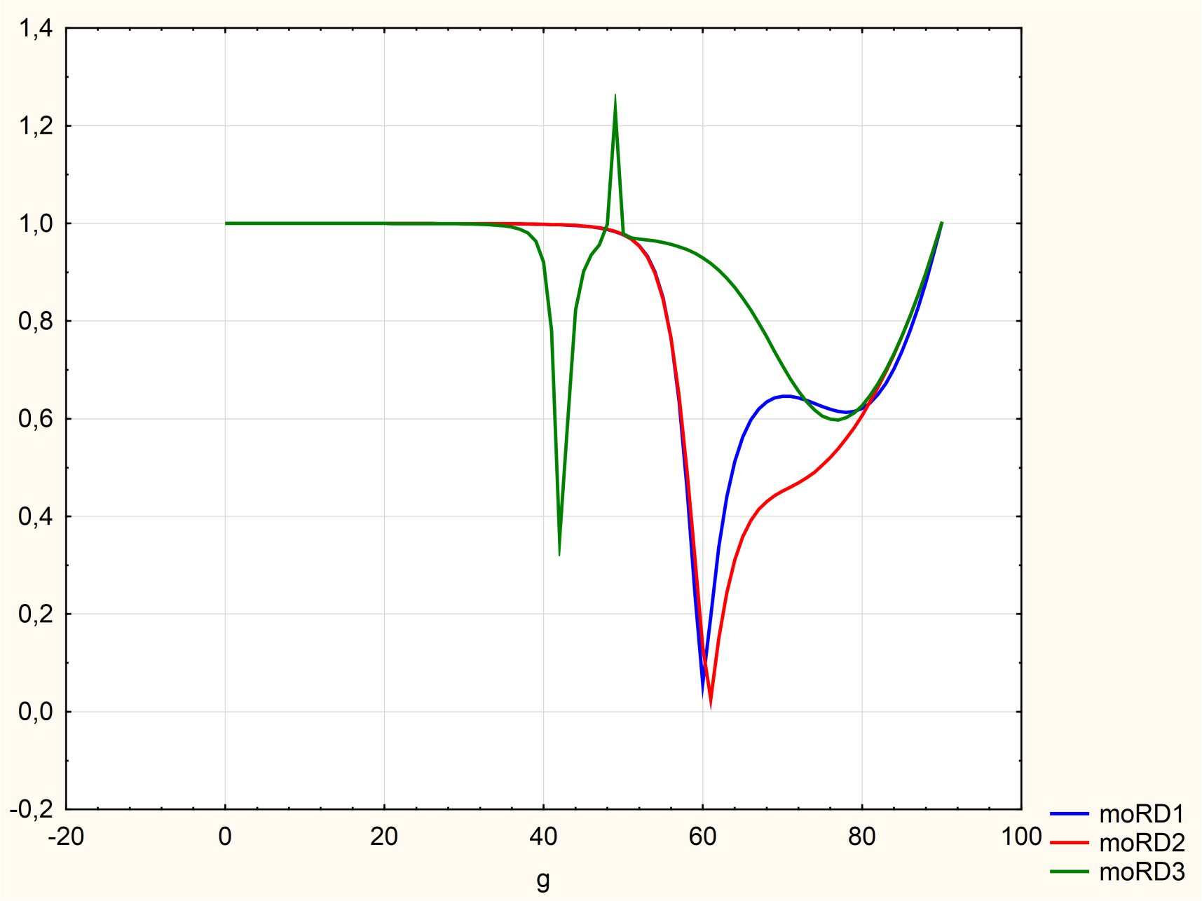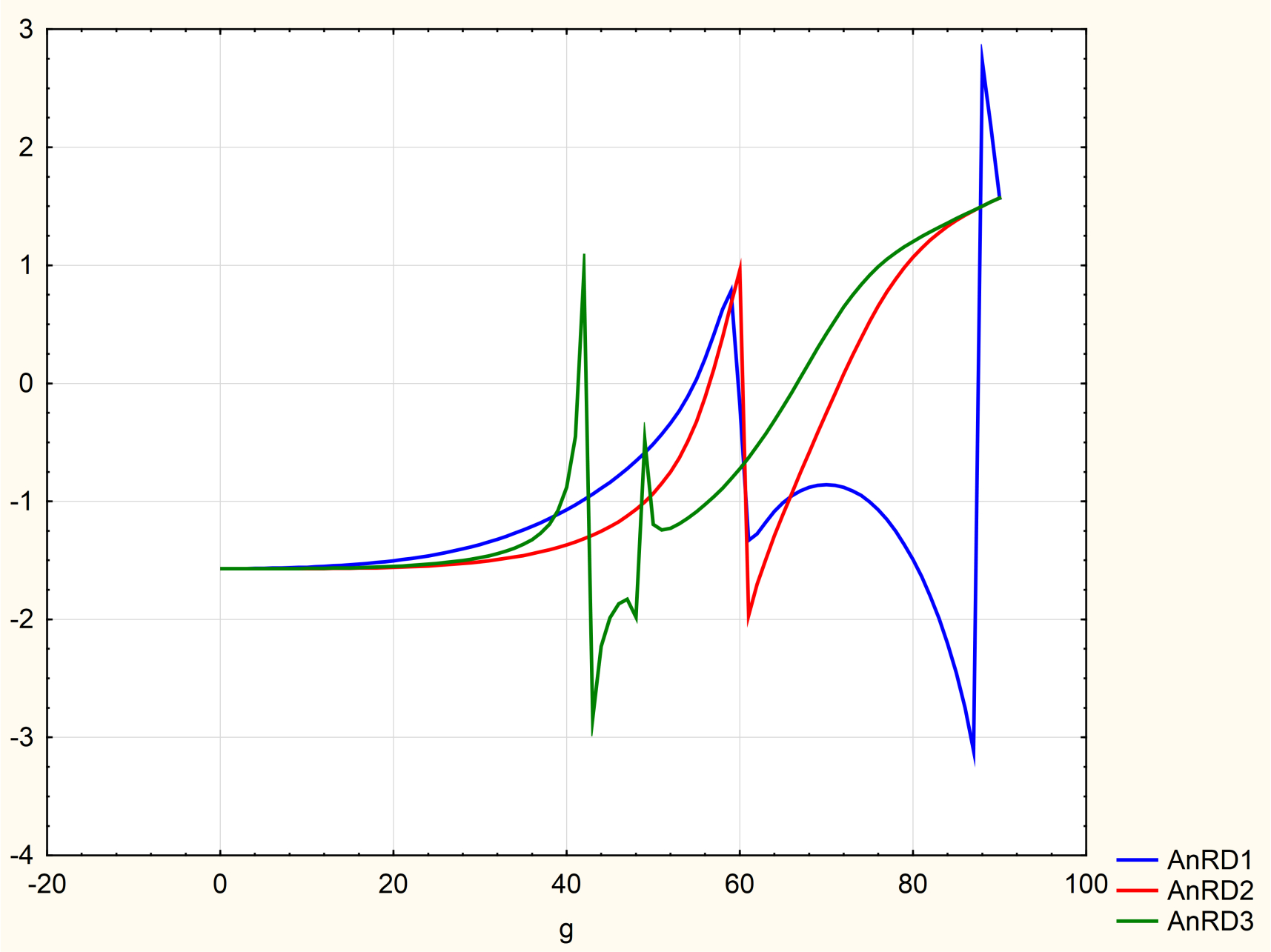 Рис. 6. Дефект с проводимостью. Правая поляризация. Эллипс поляризации g = 46°, ρ = 0,0683, ∆=−1,167