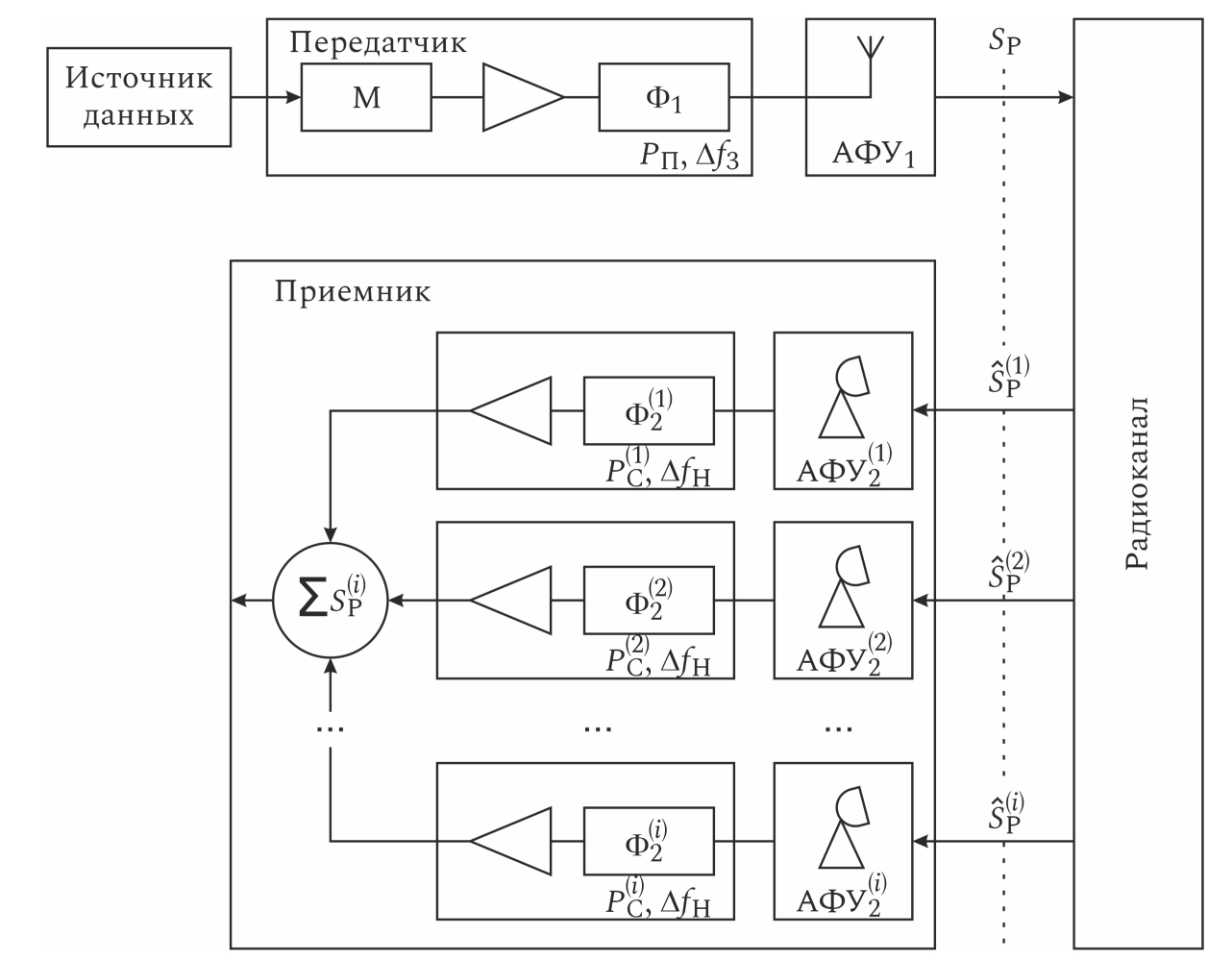 Очевидно, при сложении таких сигналов ввиду того, что дополнительные модулирующие колебания (огибающие) у всех реализаций различны, какого-либо положительного эффекта не произойдет. Под положительным эффектом при этом будем понимать повышение уровня суммарного сигнала, приводящее к увеличению отношения сигнал/шум, следовательно, к уменьшению ошибки на бит или повышению достоверности принимаемых данных. Таким образом, одним из факторов, влияющих на отношение сигнал/шум суммарного сигнала, является пространственная синхронизация (синхронизация ОГ передатчика и приемников) [10].