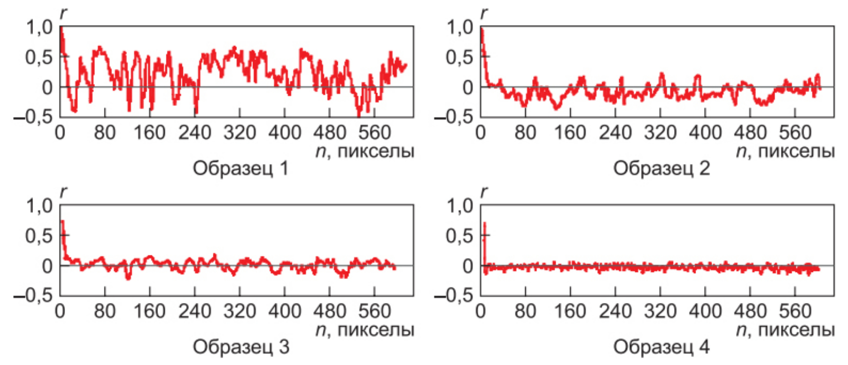 Рис. 3. Характерные графики коэффициентов корреляции изображений эталонных образцов 1–4 (зависимости коэффициентов корреляции r от количества n пикселов в строке изображения)