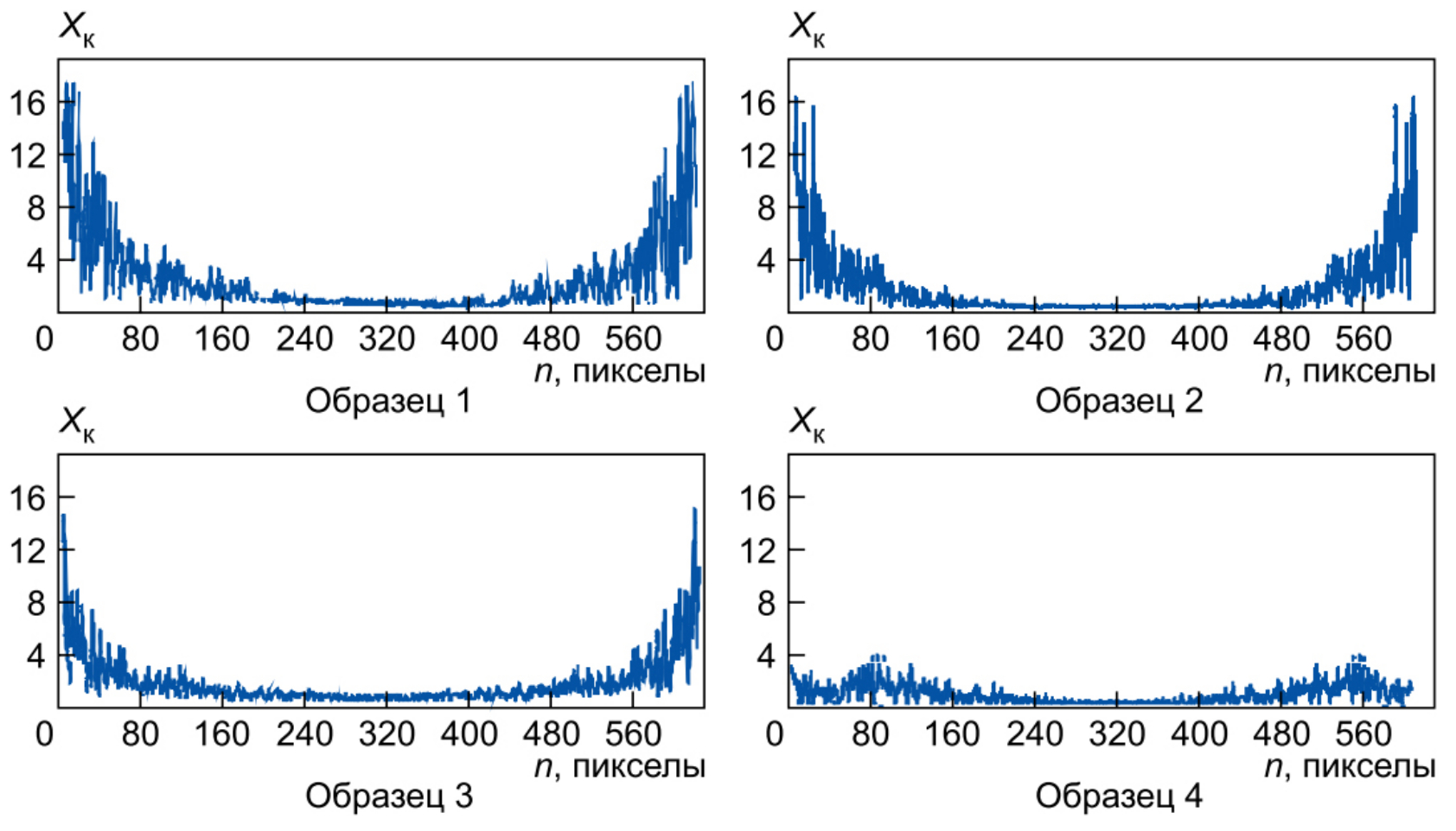 Полученные огибающие комплексных амплитуд Xк спектров для изображений исследуемых микрорельефов представлены на рис. 4. Основная мощность корреляционного сигнала для микрорельефов с более грубой поверхностью сосредоточена в области нижних и верхних пространственных частот. С уменьшением высотных параметров микрорельефа эта особенность спектров нивелируется и для образца 4 полностью исчезает. Отмеченная особенность рассматриваемых спектров связана с двумя источниками возникновения микронеровностей поверхности – детерминированной периодической основной составляющей и случайным компонентом, который накладывается на эту основу [14].