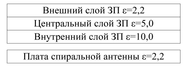 Образцы 1–3 имеют конструктивную модификацию в виде ЗП. В проведенных исследованиях ЗП выполнена трехслойной с базовой диэлектрической проницаемостью слоев, равной 10; 5 и 2,2 соответственно, толщина слоев равна толщине платы спиральной антенны (рис. 2).