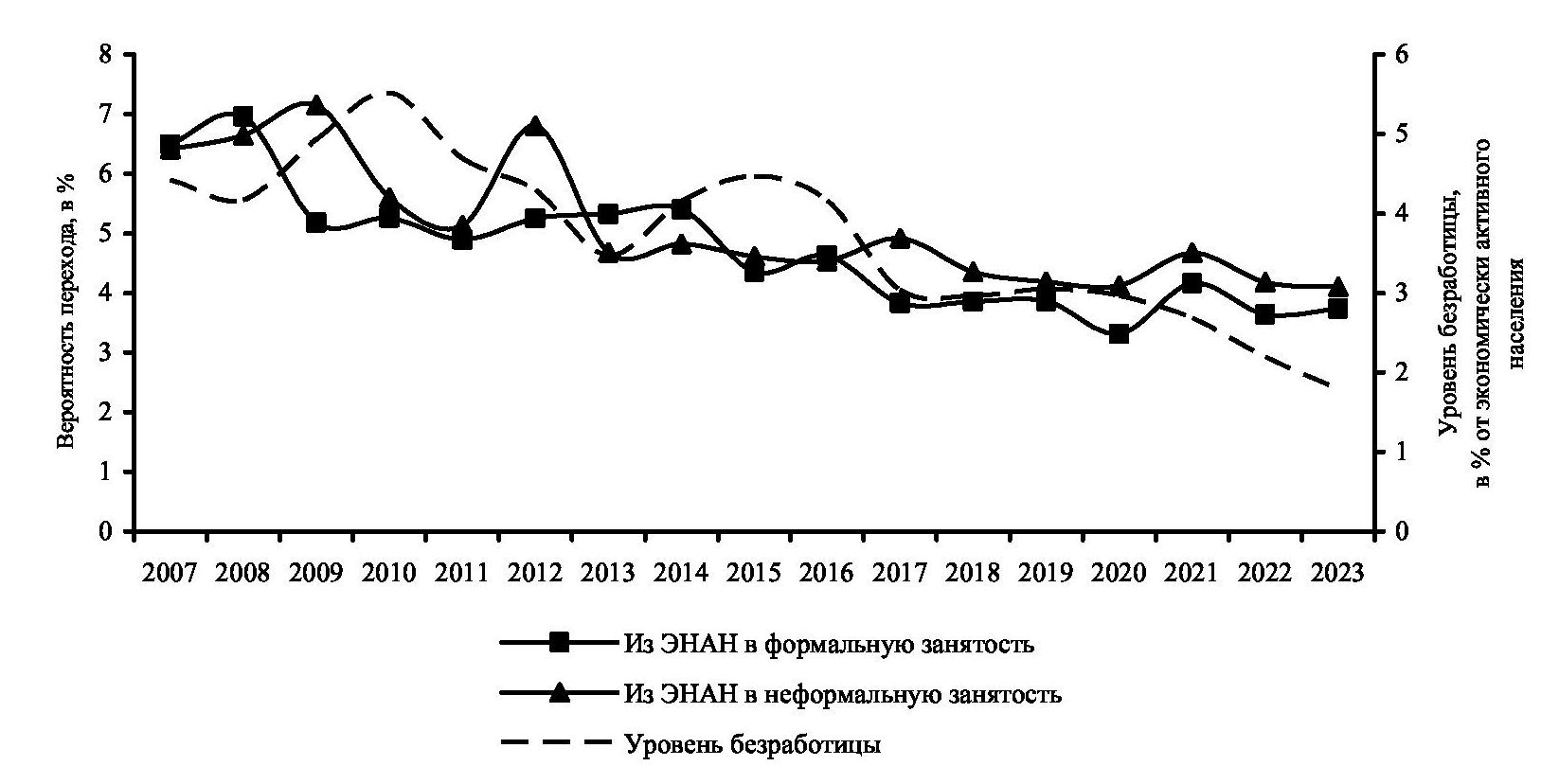 9 Всего за период 2007–2023 гг. было рассчитано 16 матриц, и для составления одной матрицы была необходима информация о текущем положении респондента на рынке труда в году N и о его положении в следующем году N + 1. Если в условном году M или следующим за ним M + 1 необходимые данные по какому-либо респонденту отсутствовали, то он не принимал участия в расчете этой матрицы, и при этом в расчет включались новые респонденты, которые наблюдались как в году М, так и в году M + 1. Информация из матриц далее использовалась для построения временных рядов для анализа динамики вероятностей перехода, представленная на рис. 2–5.