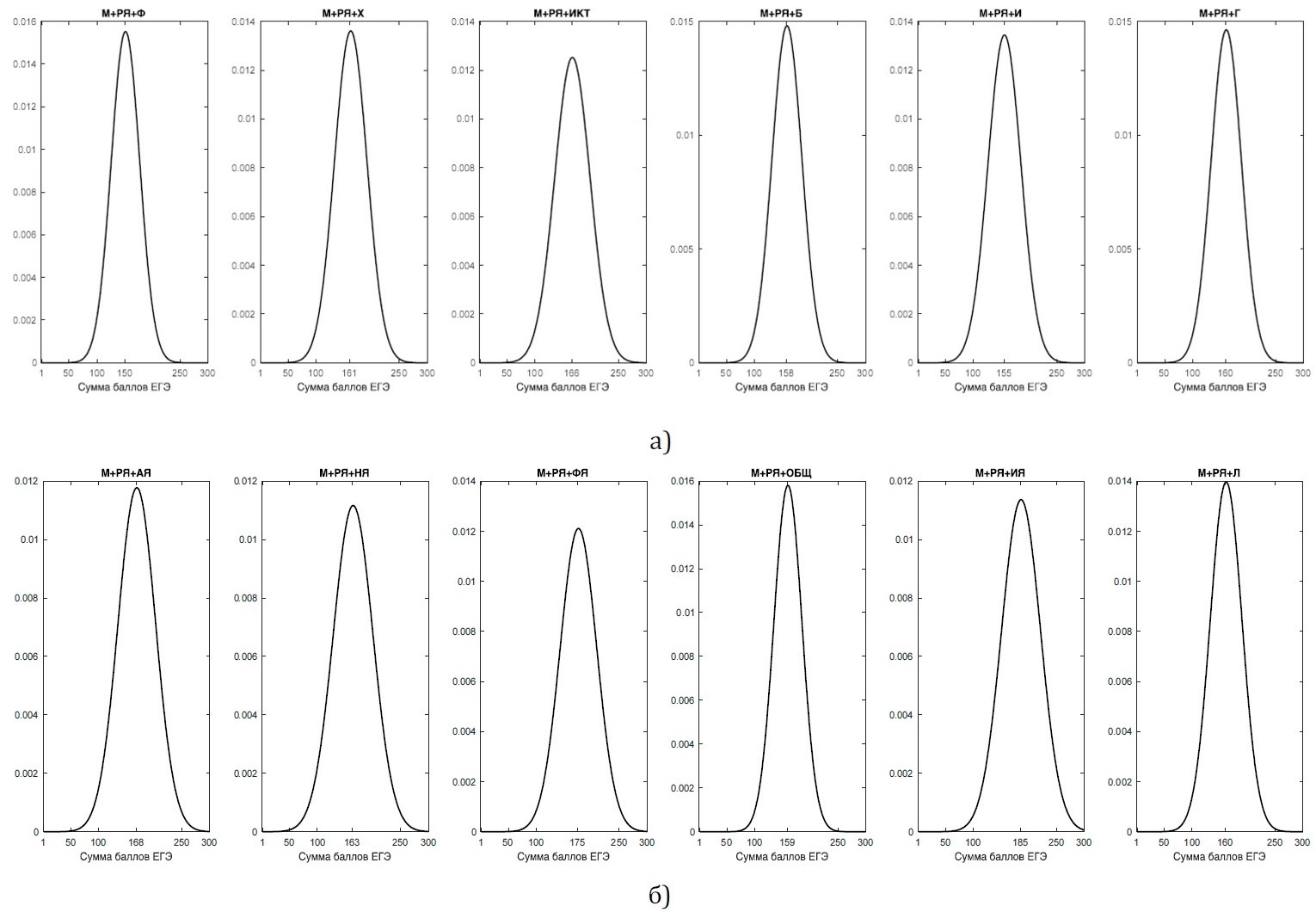 Рассмотрим полученные функции плотности распределения суммы баллов ЕГЭ для всех возможных вариантов экзамена из математики, русского языка и предмета по выбору (рис. 1).
