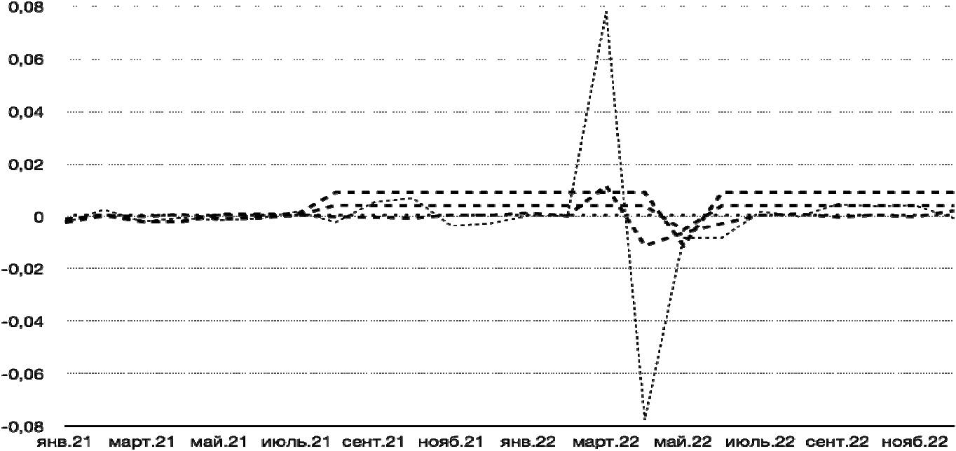 На рис. 2 представлена помесячная инфляция в Пермском крае с января 2010 г. по декабрь 2022 г. Заметим, что несколько месяцев характеризуются резким ростом инфляции. Данный паттерн характерен и для всех остальных 13 исследуемых регионов ПФО. Инфляция в Пермском крае – нестационарный процесс, что подтвердил расширенный тест Дики – Фуллера.