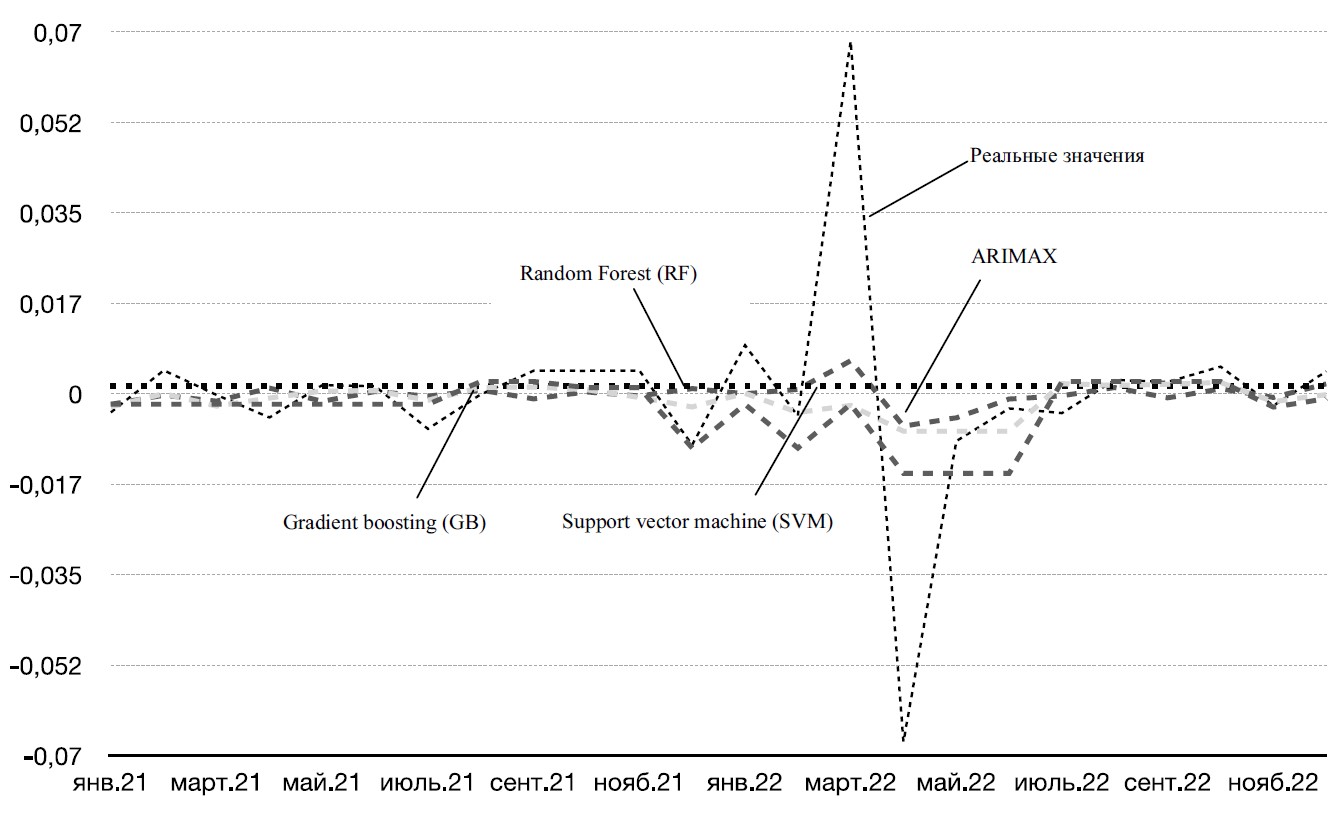 Бенчмарк (базовая модель) в работе – модель авторегрессии первого порядка AR(1). В целях сравнения моделей машинного обучения и эконометрических моделей по каждой модели машинного обучения мы рассматриваем отношение RMSEmodel к RMSEAR. Если значение показателя меньше единицы, то прогноз по сравниваемой модели лучше бенчмарка, если больше единицы – хуже. В исследовании используется прямая модель авторегрессии, в которой прогноз строится сразу на момент времени (t + k). Количество лагов в модели (p) подбирается с помощью Байесовского информационного критерия (BIC). Следуя методологии в исследовании [Семитуркин, Шевелев, 2022], помимо AR(1) в работе мы рассматриваем модель ARIMAX – модификацию модели авторегрессии-скользящей средней с включением дополнительных факторов. Как и в работе Семитуркина и Шевелева, в качестве внешнего фактора мы используем курс доллара США. Количество лагов в модели (p, q) выбрано на основании значения критерия BIC. Поскольку прогнозирование осуществляется в режиме псевдореального времени, для прогноза подставляется фактическое значение курса доллара. Такой подход имеет определенные ограничения, наиболее важное из которых заключается в том, что при переходе к прогнозированию в режиме реального времени значения валютного курса на несколько периодов вперед не представляется спрогнозировать с достаточной точностью. Тем не менее модельная оценка валютного курса может быть еще более смещенной, что побудило авторов статьи остановиться на использовании реальных значений курса и прогнозировании в режиме псевдореального времени.