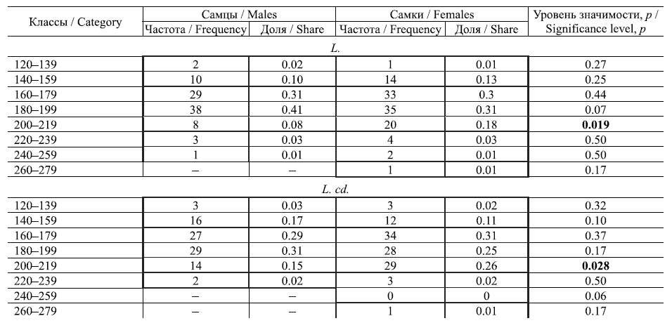 В размерном классе 200 – 219 мм по длине тела (z = 2.12, p = 0.019) и по длине хвоста (z = 2.2, p = 0.028) преобладали самки. Число самцов и самок в остальных размерных классах L. и L. cd. статистически значимо не различалось.