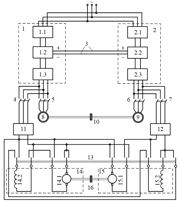 Стенд для испытания электрических машин (см. рисунок 1) состоит из следующих элементов: 1 и 2 – ПЧ; 1.1, 2.1 – диодные выпрямители; 1.2, 2.2 – звенья постоянного тока (ЗПТ); 1.3, 2.3 – управляемые инверторы напряжения; 3 – шина постоянного тока, соединяющая ЗПТ двух преобразователей; 4 – 7 –контакторы; 8, 9 – испытуемая и нагрузочная АМ; 10, 16 – соединительные муфты; 11, 12 – неуправляемые выпрямители; 13 – коммутатор (или группа контакторов); 14, 15 – испытуемая и нагрузочная МПТ; 14.1, 15.1 – обмотки якоря; 14.2, 15.2 – обмотки возбуждения.