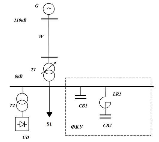 В представленной схеме присутствуют такие элементы, как воздушная линия электропередачи W, силовой понижающий трансформатор 110/6 кВ T1, силовой трансформатор 6/0,4 кВ T2, питающий выпрямительную установку UD, а также фильтрокомпенсирующая установка (ФКУ).
