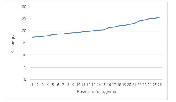 Важнейшим социальным индикатором эффективности функционирования любого региона является общая площадь жилых помещений, приходящаяся в среднем на одного жителя, выраженная в квадратных метрах. Построим кусочно-линейную авторегрессионную модель (2) динамики этого показателя на основе статистической информации по Иркутской области [15] за 1995–2020 годы (рисунок).