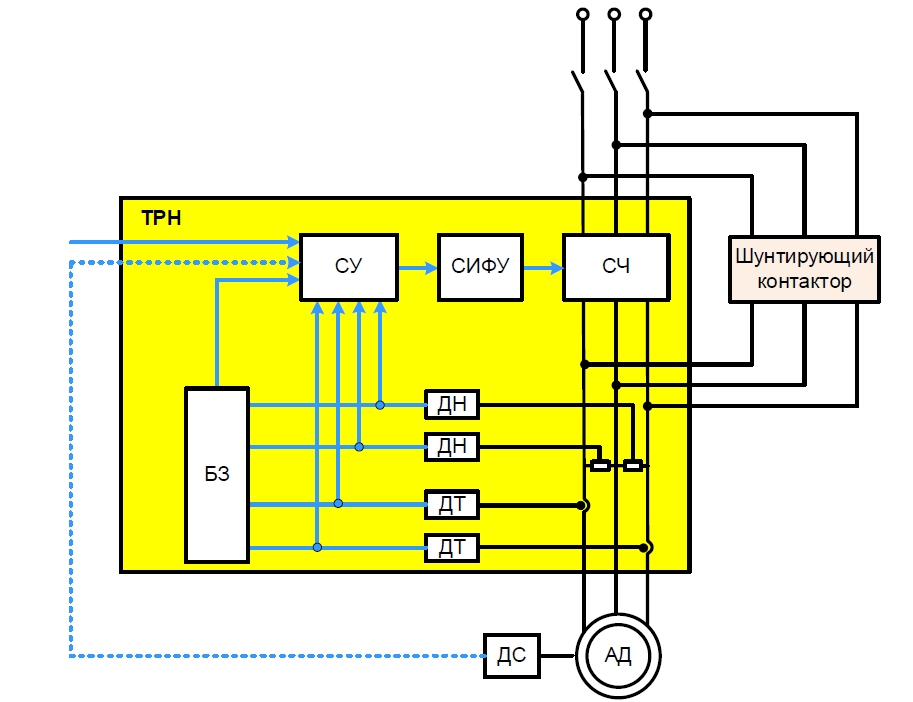 Каждая фаза АД подключена непосредственно к СЧ тиристорного регулятора напряжения. СУ формирует необходимые алгоритмы управления при пуске и торможении для электропривода. СИФУ осуществляет управление тиристорами согласно заданию, полученному с выхода блока СУ. В состав электропривода с тиристорным регулятором напряжения могут входить встроенные датчики тока и напряжения, которые позволяют повысить качество плавного пуска и обеспечить защиту при возникновении аварийных ситуаций с помощью блока БЗ. Для повышения надежности и эффективности в электроприводах с тиристорным регулятором напряжения используют шунтирующий контактор, который позволяет подключить двигатель напрямую в сеть.