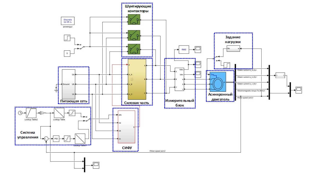 Для исследования переходных процессов в электроприводе ТРН-АД использовалась имитационная модель (рис. 2), которая была реализована в программной среде Matlab Simulink 2021a и включает в себя следующие основные элементы: питающая сеть, система управления, шунтирующие контакторы, измерительный блок, задание нагрузки, асинхронный двигатель.