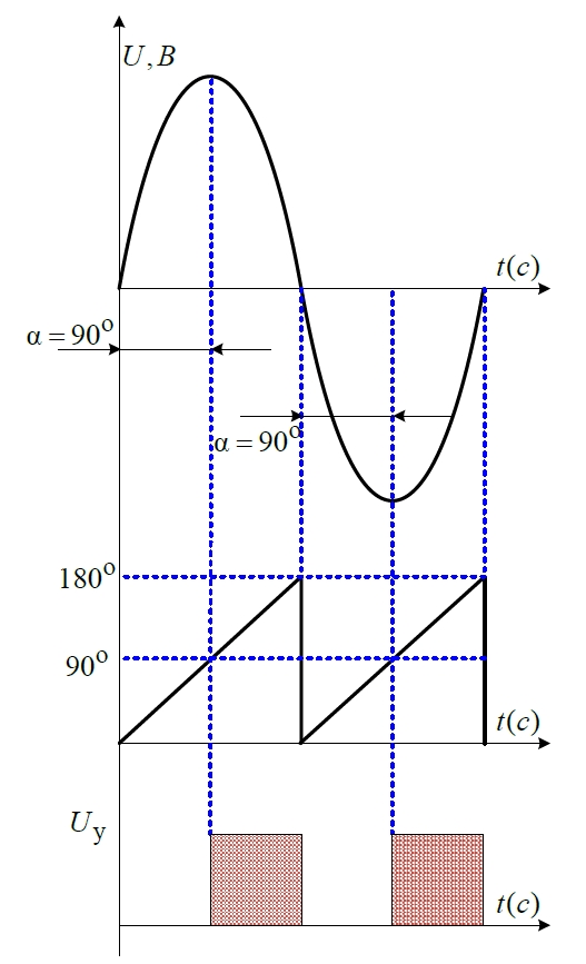 Алгоритм формирования управляющих импульсов для тиристоров показан на рис. 3. Принцип работы данной системы построен на двух основных элементах: источник с пилообразным сигналом и компаратор. Для правильной работы необходимо источник с пилообразным сигналом синхронизировать с соответствующей фазой. Далее на один из входов компаратора подается задающий сигнал, а на второй пилообразный, затем после сравнения этих сигналов формируется задержка для включения тиристора. С помощью логических элементов «И» определяется на какой из тиристоров будет подан управляющий сигнал. Принцип управления для других фаз аналогичен.