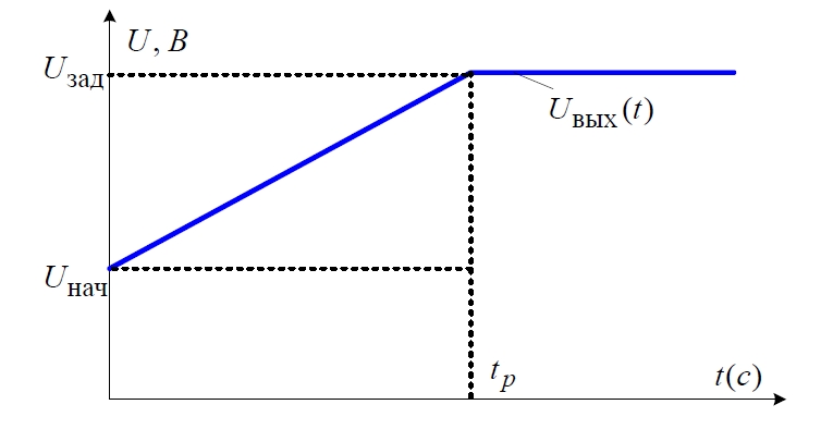 Выбор оптимальных параметров для линейного задатчика интенсивности является важной задачей при обеспечении плавного пуска. К одному из самых простых для настройки можно отнести линейный задатчик интенсивности, который имеет два основных параметра: начальное задание и время нарастания напряжения задания до максимального значения (рис. 2). Изменяя данные параметры, можно добиться наилучших показателей при использовании устройств планового пуска на базе тиристорного регулятора напряжения. Если задать слишком малое значение времени разгона для линейного задатчика интенсивности, то положительный эффект от плавного пуска АД проявляться не будет. При значительном увеличении времени разгона могут возникнуть дополнительные нагрузки на АД и силовой преобразователь, которые будут проявляться в виде нагрева. Помимо этого, увеличивается время разгона двигателя до заданной величины. Стоит разграничивать время разгона двигателя до заданной величины tп и время нарастания напряжения задания до максимального значения tр. Первый параметр может меняться в зависимости от нагрузки на валу двигателя при постоянной величине tр в линейном задатчике интенсивности.
