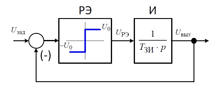 Структурная схема задатчика интенсивности показана на рис. 6, которая состоит из сумматора, релейного элемента РЭ и интегрального звена «И». Выходное напряжение задатчика интенсивности определяется следующим выражением: