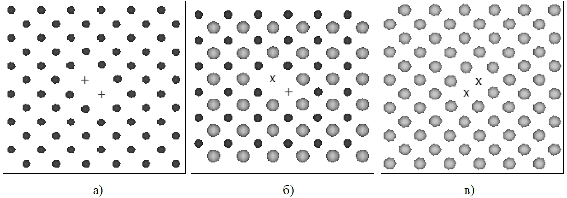 В сплаве CuAu I возможны три типа бивакансий (рисунок 3). Бивакансии, образованные из вакантных узлов одного сорта, располагаются на моноатомных плоскостях в направлении <001>. Бивакансии, образованные из вакантных узлов разного сорта, – на биатомных плоскостях в направлении <100> или <010>.