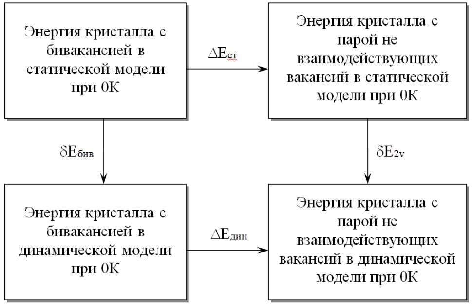 Изменение энергетических характеристик сплава при наличии в нем двух вакансий представлено схемой (рисунок 4). Во всех случаях расчетные блоки содержат одинаковое число атомов в объеме кристалла.