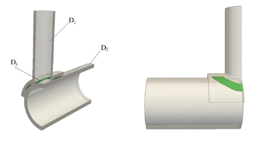 На рисунке 1 представлена расчетная область Ω седлового отвода (подобласть D1) и участка полиэтиленовой трубы (подобласть D2). Для сокращения времени расчета рассматривалась четвертая часть трубы с седловым отводом. Нагревательный элемент (подобласть D3), вмонтированный в тело седлового отвода, представляет собой кольцо с толщиной равной диаметру проволоки нагревателя.