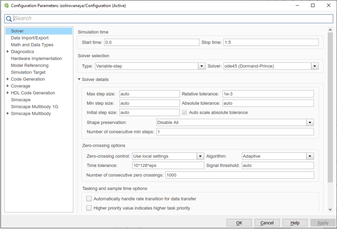 Прежде чем приступить к исследованию переходных процессов в сетях с изолированной нейтралью в MATLAB Simulink, необходимо составить расчетную схему и определиться с параметрами блоков. Исследование и расчет выходных параметров производились с помощью решателя ode45, окно настройки и выбора которого показано на рисунке 1.