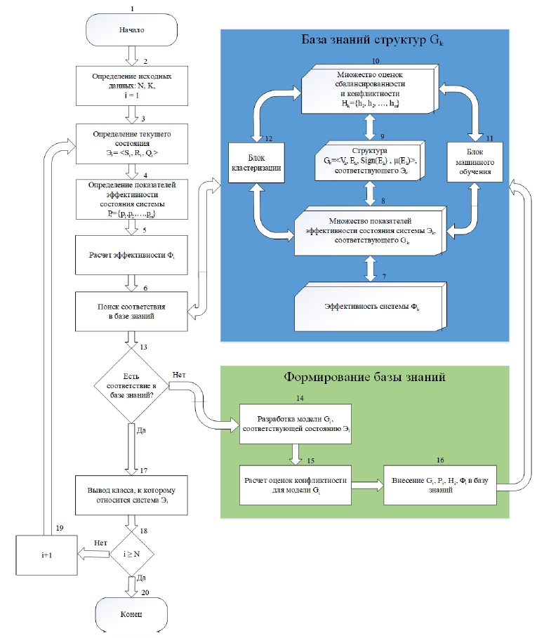 Приведем описание разработанного алгоритма. В блоке 2 задаются исходные данные, включающие в себя количество состояний систем , подлежащих анализу; количество классов , к которым могут быть отнесены исследуемые состояния систем; индекс текущего состояния системы . В блоке 3 определяются структурно-параметрические свойства -го состояния системы, т. е. тройка множеств . Далее в блоке 4 определяются показатели эффективности -го состояния с использованием специализированного программного обеспечения, предназначенного для мониторинга сетей, такого как Zabbix [24], PRTG Network Monitor [25] и др. После расчета эффективности системы (блок 5) осуществляется взаимодействие с базой знаний (блок 6). Процедура поиска соответствия в базе знаний (блок 13) заключается в нахождении в базе знаний состояния , удовлетворяющего условию: