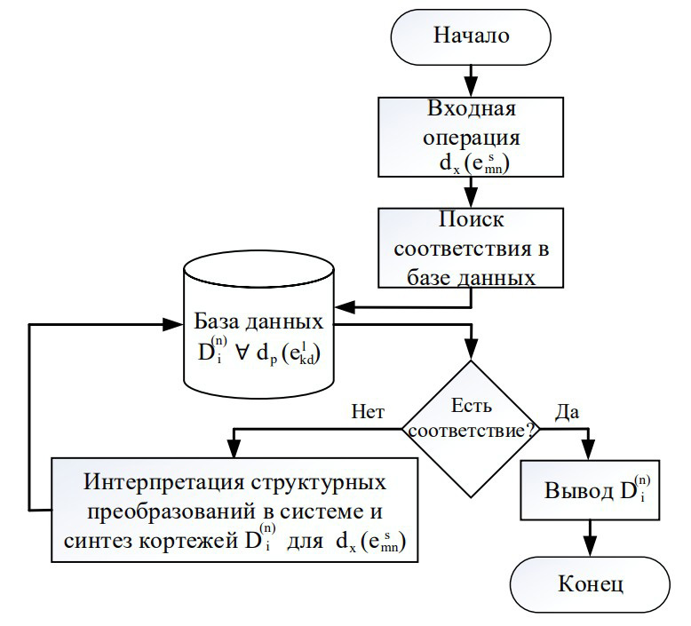 Для того, чтобы сократить временные ресурсы при формирования можно предложить использование базы данных, которая будет содержать информацию о необходимых дополнительных структурных преобразованиях графовых моделей (промежуточных состояниях) для перехода из в при явном определении и оценке каждого процесса , который может быть реализован элементами системы. Такая база данных будет содержать кортежи , требуемые для выполнения операций , и при необходимости может пополняться. Для этого предложим вспомогательный алгоритм, осуществляющий инициализацию всех имеющихся в системе процессов и позволяющий определять состав кортежей для каждой операции , входящей в состав исходного кортежа операций прямого перехода из в . Блок-схема такого алгоритма представлена на рисунке 1.