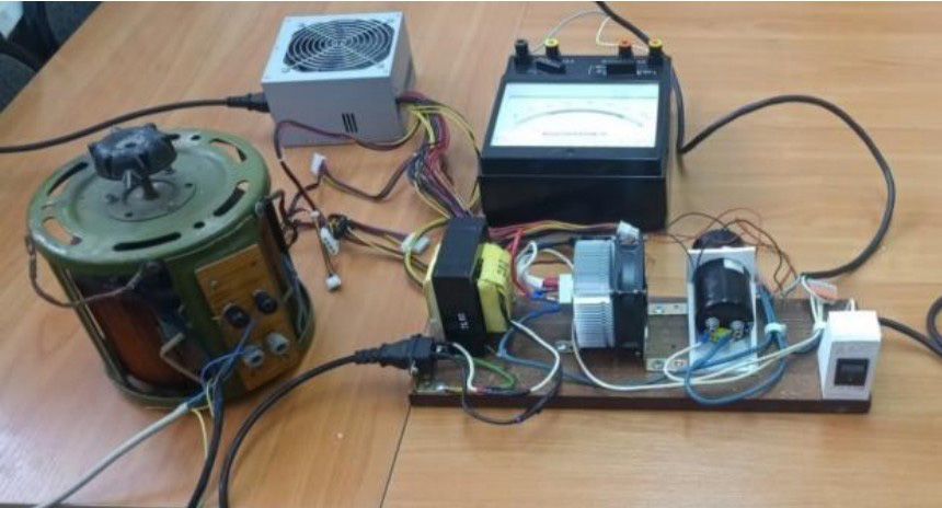Для определения влияния угла атаки ветра на нагрев и охлаждения самонесущего изолированного провода СИП 3 сечением 16 мм2 были проведены экспериментальные исследования. На рисунке 1 представлен общий вид экспериментального стенда, который условно можно разделить на 2 составляющих: первый – «силовой блок» и второй – аэродинамическая труба (рисунок 2) с блоком управления скоростью ветра (рисунок 3). В основе «силового блока» лежит модифицированный трехфазный трансформатор 220/110 В. В ходе эксперимента была задействована только одна фаза. Изменение тока через образец провода производилось при помощи лабораторного автотрансформатора, к выводам вторичной обмотки которого был подключен силовой трансформатор.