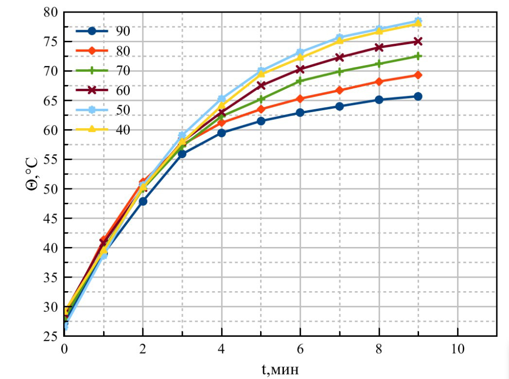 В ходе экспериментального исследования были получены зависимости изменения температуры провода с течением времени при различных углах. На рисунке 7 представлены изменения температуры жилы и изоляции при угле 90°, а на рисунке 8 – при угле 50°. Из представленных рисунков видно, что на 9 минуте разность между температурой жилы и температурой изоляции составляла от 4 до 8 °C, что соответствует ранее предложенным гипотезам.