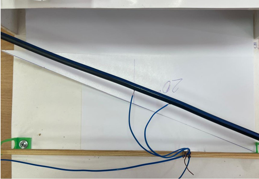 Эксперимент по исследованию влияния ветра (скорость ветра и его направление) на нагрев провода марки СИП проводился при следующих условиях: в начальный момент времени проводник длительное время находился без нагрузки, то есть можно считать, что температура провода в начальный момент времени была установившейся, т. е. равной температуре окружающего воздуха. Далее ток изменялся скачкообразно до значения 130А. При начальном нагреве скорость ветра составляла 0,6 м/с, а в дальнейшем – скачкообразно увеличилась до значения 1,75 м/с. Во время проведения эксперимента производилось изменение угла направления ветра относительно оси провода. Угол задавался, как показано на рисунках 4-6. На рисунке 5 представлен способ установки температурных датчиков. Так как используемый при эксперименте термометр имеет два выхода для подключения датчиков, производился одновременный контроль температуры жилы и изоляции.