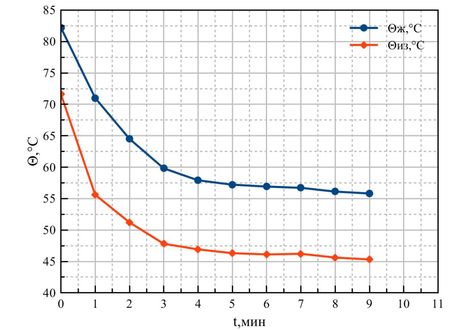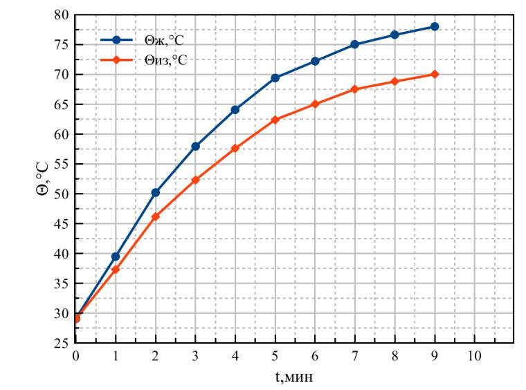 В ходе экспериментального исследования были получены зависимости изменения температуры провода с течением времени при различных углах. На рисунке 7 представлены изменения температуры жилы и изоляции при угле 90°, а на рисунке 8 – при угле 50°. Из представленных рисунков видно, что на 9 минуте разность между температурой жилы и температурой изоляции составляла от 4 до 8 °C, что соответствует ранее предложенным гипотезам.