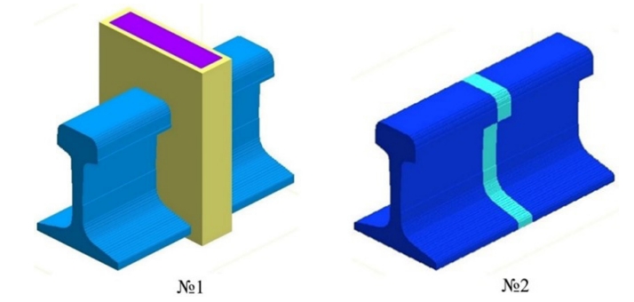 Рисунок 3. Трехмерные модели термитных сварных соединений рельсов: № 1 – модель сварного соединения с литейной формой, № 2 – модель сварного соединения без литейной формы.