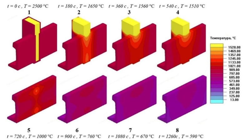 На рисунке 5 представлены результаты моделирования теплообмена системы «литейная форма – сварной шов – рельс». Модели 1–4 отображают изменение температуры с момента заливки жидкого металла в литейную форму до момента её демонтажа. Наибольший отвод тепла происходит в свариваемые рельсы. При этом подошва рельса и шейка рельса охлаждаются быстрее, чем головка. Это объясняется тем, что над головкой рельса имеется прибыльная часть, в которой в последнюю очередь происходит кристаллизация сплава.