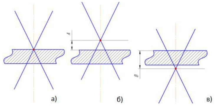 Для осуществления лазерной сварки были рассмотрены три варианта расположения фокуса лазерного луча: над поверхностью (рисунок 3а) («плюсовой фокус»), на поверхности (рисунок 3б) («в фокусе») и под поверхностью (рисунок 3в) металла («минусовой фокус»).