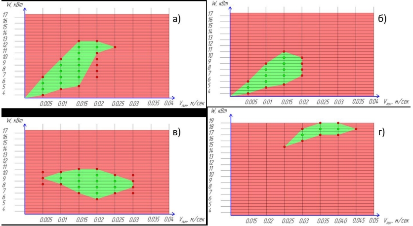 Толщина стенки после проточки могла оказаться толщиной от 4,5 до 5 мм. Поэтому для каждой трубы с индивидуальной толщиной стенки была подобрана мощность лазера. Мощность лазера при сварке последней четверти трубы была снижена, т. к. металл трубы в процессе сварки разогревался, и требовалось меньшее тепловложение. Первый этап экспериментов проводился по двухфакторной схеме: изменение скорости и мощности ЛС при прочих постоянных параметрах. Данная серия экспериментов проводилась с целью установить наиболее благоприятные режимы провара металла методом лазерной сварки с учетом варьирования смещения фокусной точки. Для установления зоны провара металла были изготовлены линейные сегменты труб из имеющихся заготовок. Сегменты прошли механическую зачистку поверхности и обезжиривание. Были установлены режимы сварки и проварены сегменты. Далее были построены графики провара при различных смещениях фокусной системы (рисунок 5).