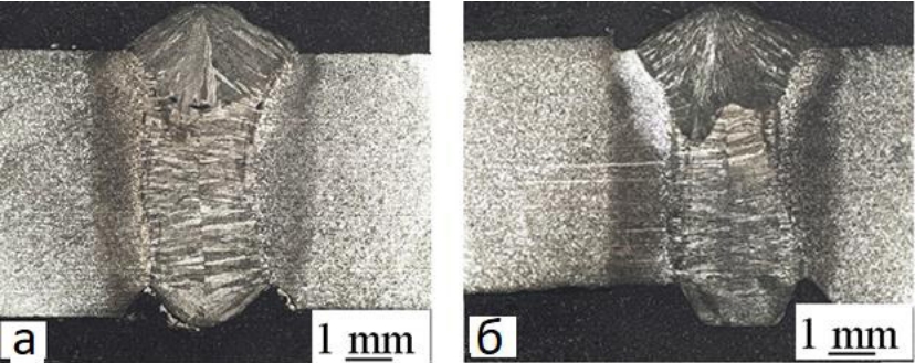 Рисунок 7. Сварной шов, полученный методом лазерной наплавки проволоки на поверхность образцов из трубной стали с мощностью лазерного излучения 2500 Вт (а), 4000 Вт (б).