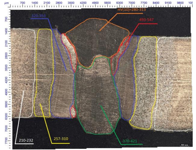 Рисунок 10. Изображение сварного соединения с указанием твердостей зон.