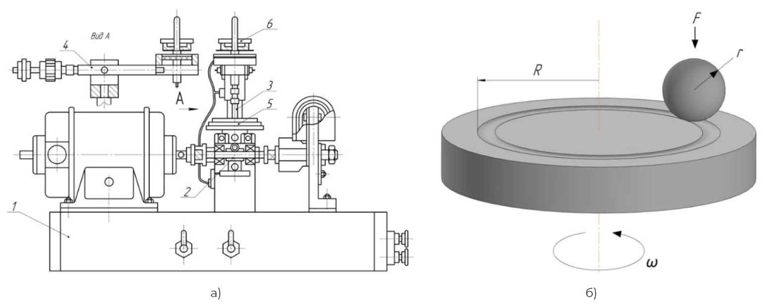 Рисунок 2. Трибологическая установка: а – конструкция установки; б – схема испытания на трибометре.