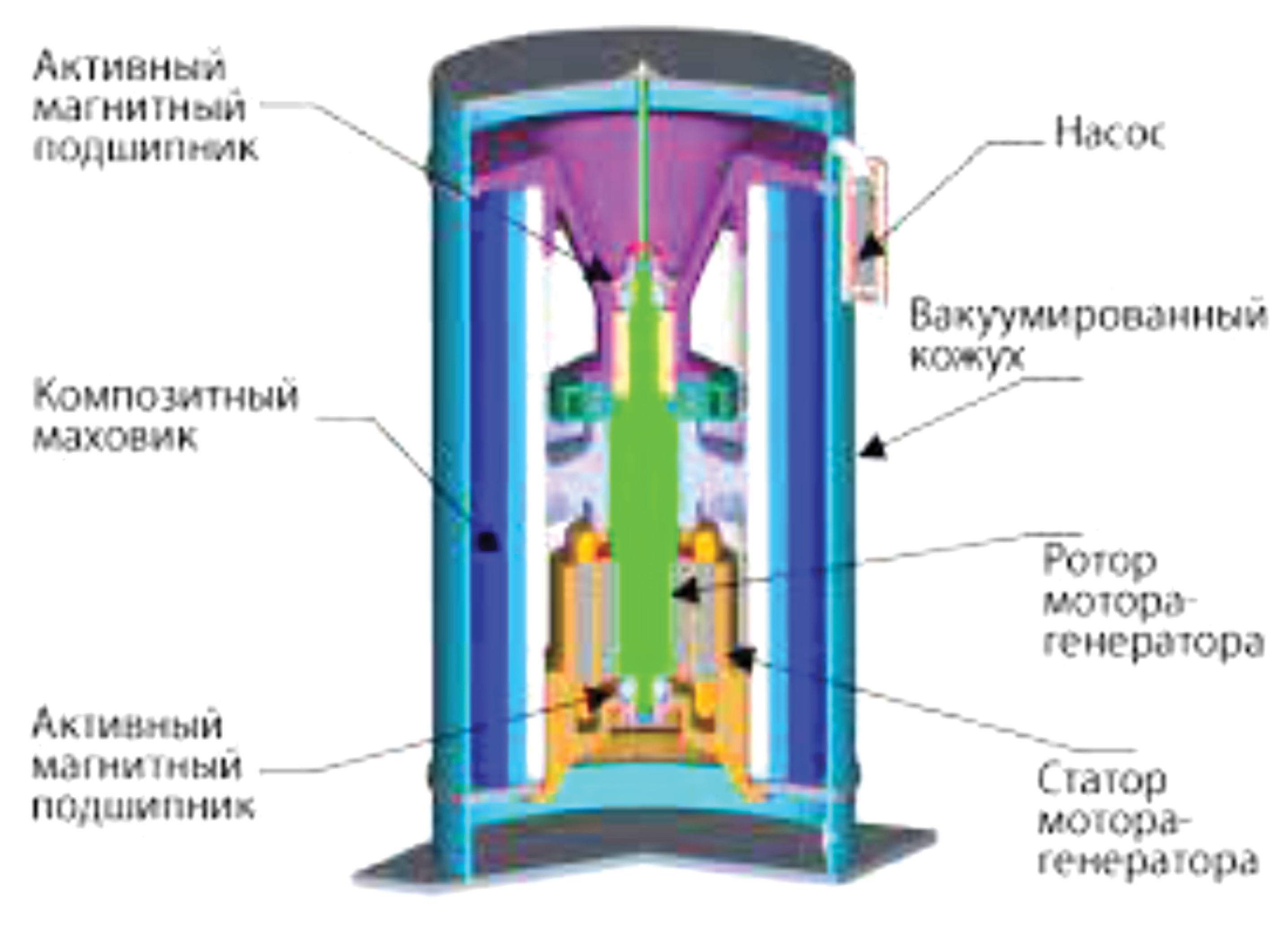 Из (1) следует, что запас накапливаемой маховиком энергии может быть увеличен двумя способами: увеличением скорости вращения (угловой скорости) и массы тела маховика. Увеличение скорости вращения приводит к росту потерь энергии и вероятному разрушению тела маховика. Эти недостатки можно нивелировать, если использовать магнитные подвесы ротора и композиционные материалы. На рисунке 2 представлена конструкция механического инерционного накопителя, совмещенного с мотором-генератором.