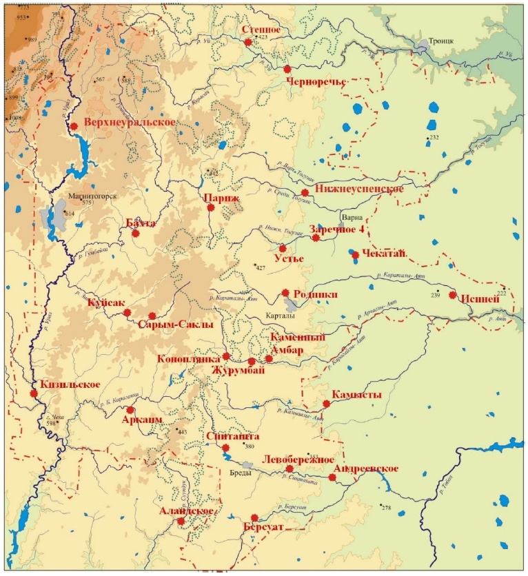 В 2023 г. было открыто два новых укрепленных поселения, расположенных в северной периферии территории обитания синташтинского населения в бронзовом веке. Открытие каждого нового укрепленного поселения само по себе является большим событием, а открытые новые памятники к тому же отчасти заполняли собой лакуну, «белое пятно» на карте «Страны городов» между двумя самыми северными поселениями (Степное и Черноречье) и остальными объектами (рис. 1).