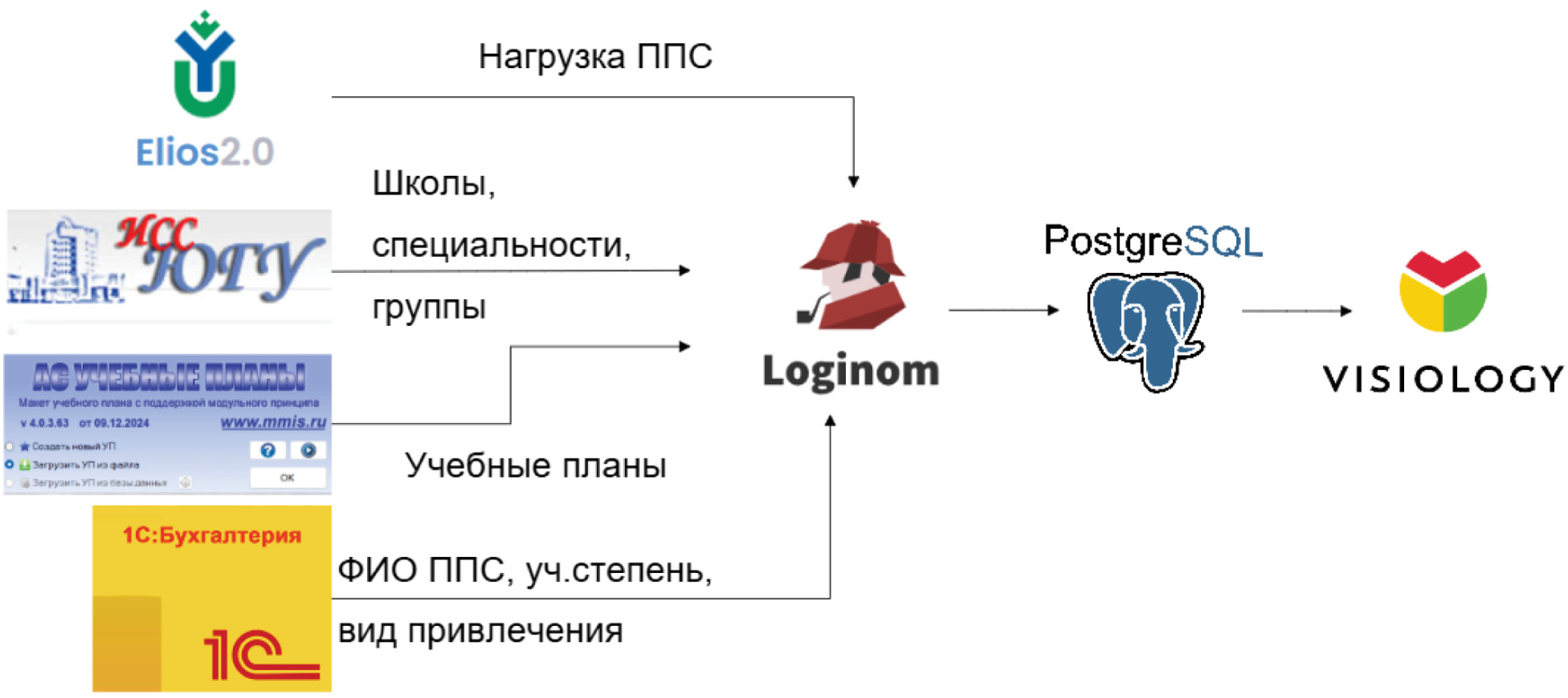 В Югорском государственном университете создана многокомпонентная информационная среда, основанная на интеграции корпоративных информационных систем: АИС «Учебные планы», «Галактика: управление вузом», 1С и отдельных цифровых сервисов. Для разработки цифрового сервиса по самообследованию в части подготовки кадровой справки было принято решение использовать аналитические платформы Loginom и Visiology.
