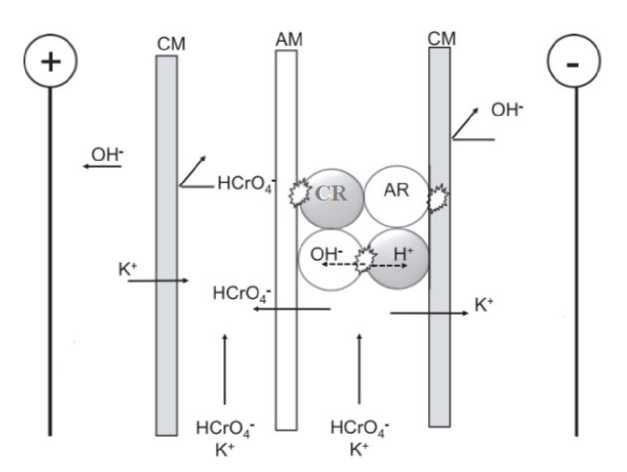 В ходе электродеионизации растворов хромата и дихромата проходят следующие реакции: