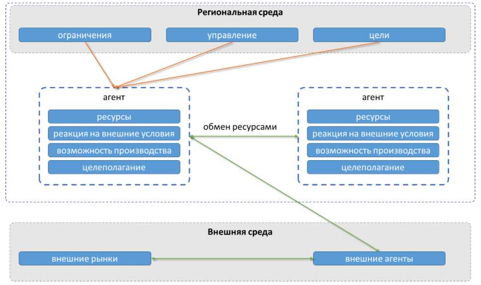 Как видно из рисунка, в качестве основного инструмента взаимодействия агенты используют возможность обмена ресурсами между собой и внешней средой, представленной внешними рынками и агентами. При этом на агентов влияют не только другие агенты, но и региональная среда, которая отвечает за ограничения действий агентов и некоторые управленческие воздействия. Кроме того, рассматривается возможность корректирования целей агентов (если агент является напрямую подчиненной структурой, например, государственным учреждением).