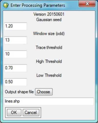 – размер окна сканирования (поле Window size). Значение по умолчанию – 13. Этот параметр равен размеру выявляемых линеаментов в пикселях и должен выражаться нечетным целым числом не менее 11.