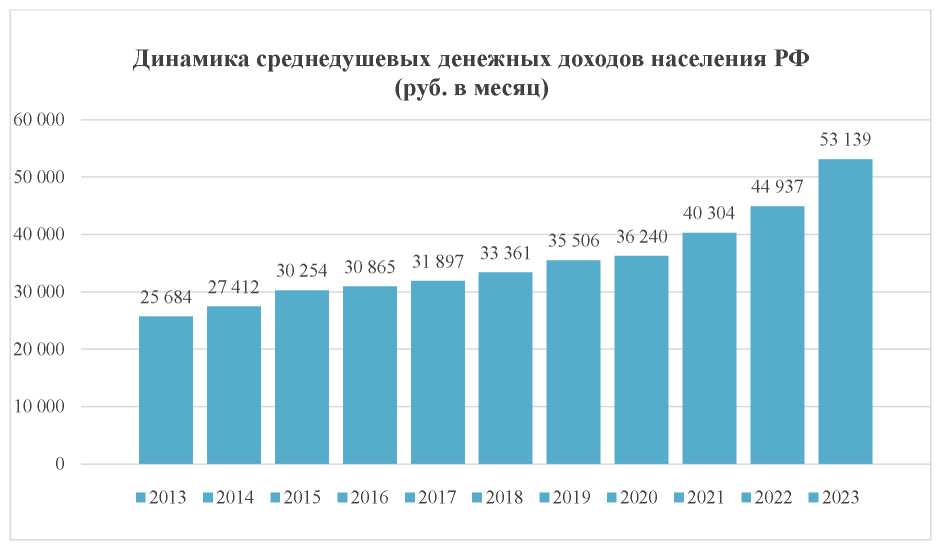 Ведущим показателем уровня жизни российских граждан являются доходы населения в расчете на одного потребителя. Данный показатель демонстрирует, насколько российский гражданин имеет ресурс для материального и духовного развития. На следующий диаграмме (рис. 2) показано развитие уровня среднедушевых доходов населения с 2013 по 2023 год.
