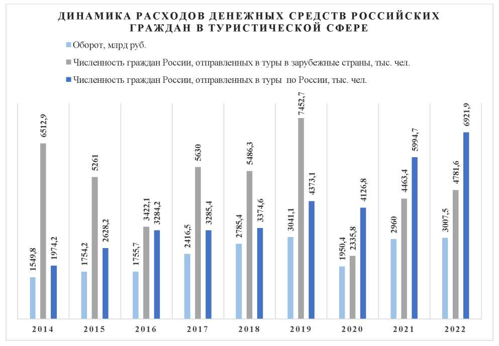 На диаграмме мы видим, что с 2020 года растет объем денежных средств в туристическом бизнесе. Если в 2021 году оборот денежных средств составлял 2960 млрд руб., то в 2022 году данный показатель увеличился на 1,6 %. Причиной тому стали введенные санкции, которые остановили отток денежных средств за рубеж. В результате российские граждане стали тратить свои средства на внутрироссийские туристические поездки. На диаграмме ясно видно, как уменьшается количество людей, выезжающих в зарубежные страны, и, наоборот, увеличивается численность тех, кто предпочел путешествовать внутри страны. Уже к 2022 году количество российских граждан, совершивших туристические поездки по России, составило 6921,9 тыс. чел., что на 2260,3 тыс. чел. больше, чем совершивших туристические поездки за границу. Таким образом, налицо изменение структуры туристических потоков. С одной стороны, рост туров по России, а с другой – уменьшение зарубежных туров и, соответственно, рост объема денежных средств, остающихся в российской экономике, и уменьшение объема денежных средств, вывозимых из страны в сферу зарубежного туризма.