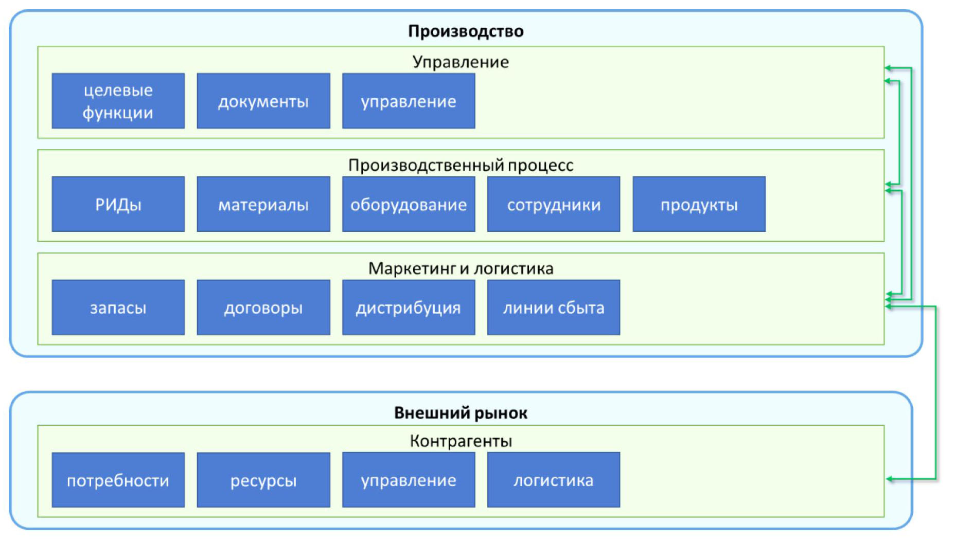 Агент производства (сотрудник, элемент оборудования или отдел предприятия) состоит из собственной системы целеполагания (не обязательно связанной с общей целью предприятия) и алгоритмом поведения. Кроме того, каждый подобный агент обладает разным набором доступных ему ресурсов, обмен которыми обеспечивает работу производственных цепочек. Вешними агентами здесь выступают государство, покупатели, партнеры и конкуренты. Внешние агенты могут обладать возможностью ограничивать работу агентов производства и иметь доступные рычаги давления, то есть возможность влияния производства на них.