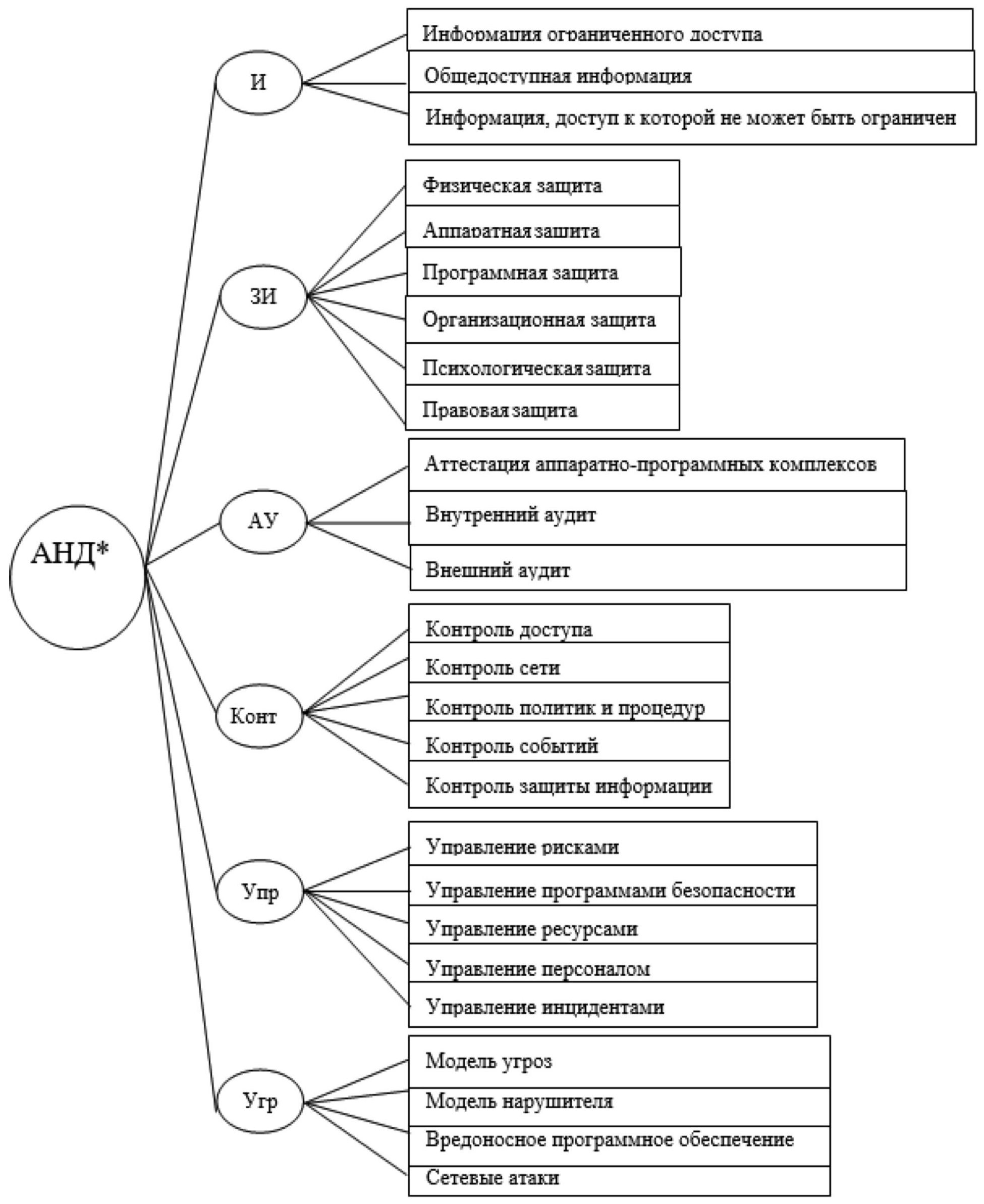 Блок «Аспекты по направлениям документов» (АНД) ввиду того, что содержит много уровней, не детализируется на данном рисунке и выделен в отдельную диаграмму декомпозиции, которая представлена на рисунке 3. Многообразие уровней в данной модели мультииерархического описания системы классификации документационного обеспечения в области ИБ обусловлено наличием нескольких различных направлений и уровней. На рисунке 3 блок «Аспекты по направлениям документов» (АНД) представлен в виде шести иерархических уровней.