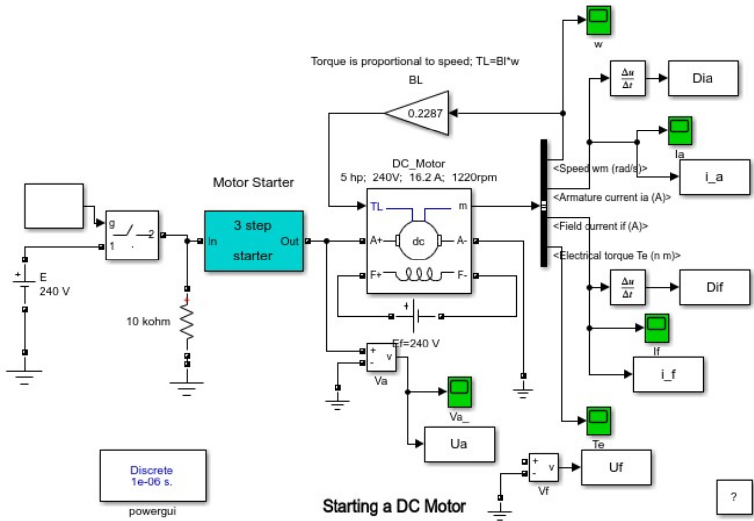 Рис. 2. Имитационная модель стартера двигателя постоянного тока с независимой обмоткой возбуждения