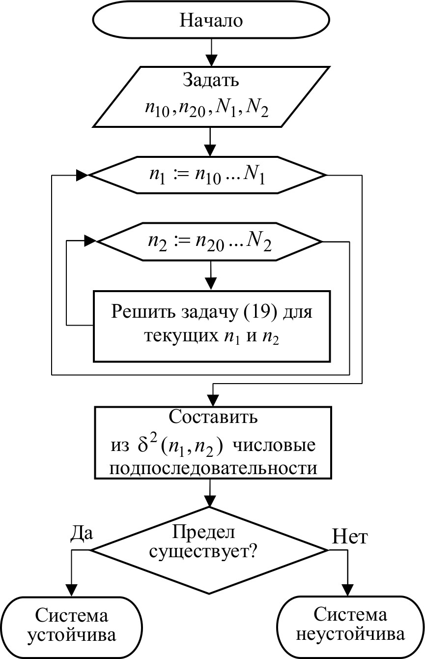 Утверждение 1. Критерий устойчивости системы (15). Пространственно-временное представление объекта (15) является устойчивым, если задача полуопределенного программирования (19) имеет решение и последовательности, составленные из δ^2(n1, n2) при увеличении  n1, n2, имеют конечный предел.